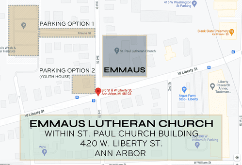 Emmaus is located inside of St. Paul Lutheran Church. There is a small parking lot on the northwest side of the building that we kindly ask you leave open for the elderly or those with limited mobility.
